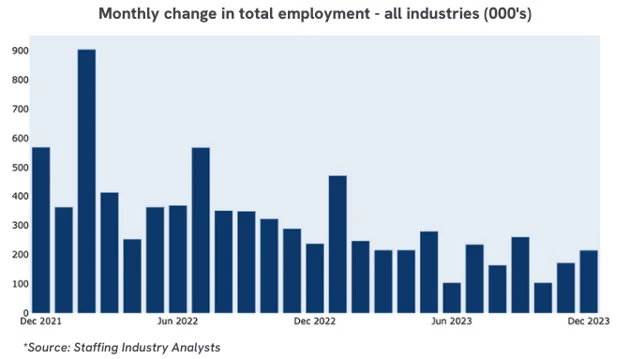 Looking ahead to what 2024 holds, SIA projects a 3% growth for the staffing industry overall (4.1% excluding travel nursing), in line with expectations for minimal GDP growth and high interest rates creating a headwind.